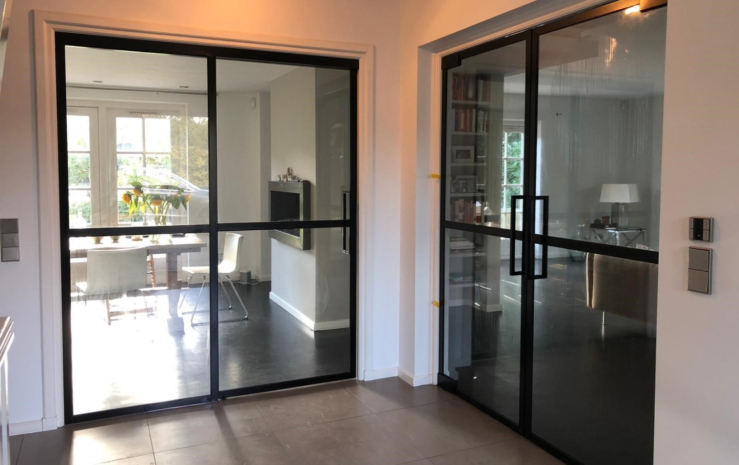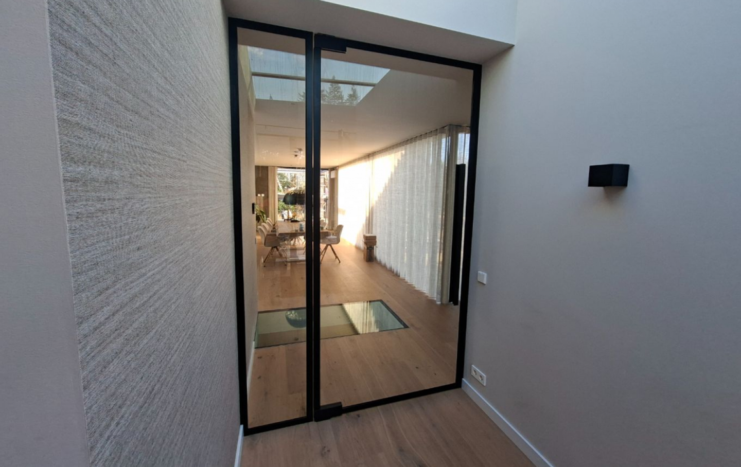 Bij steel look deuren wordt het veiligheidsglas omkleed met matzwart gecoate aluminium profielen. De steel look deuren hebben het robuuste uiterlijk van staal maar zijn goedkoper en eenvoudiger te plaatsen dan stalen deuren.